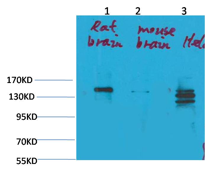 Western blot analysis of 1) Rat Brain Tissue, 2)Mouse Brain Tissue, 3) Hela with SLC12A4 Rabbit pAb EA303 diluted at 1:2,000.