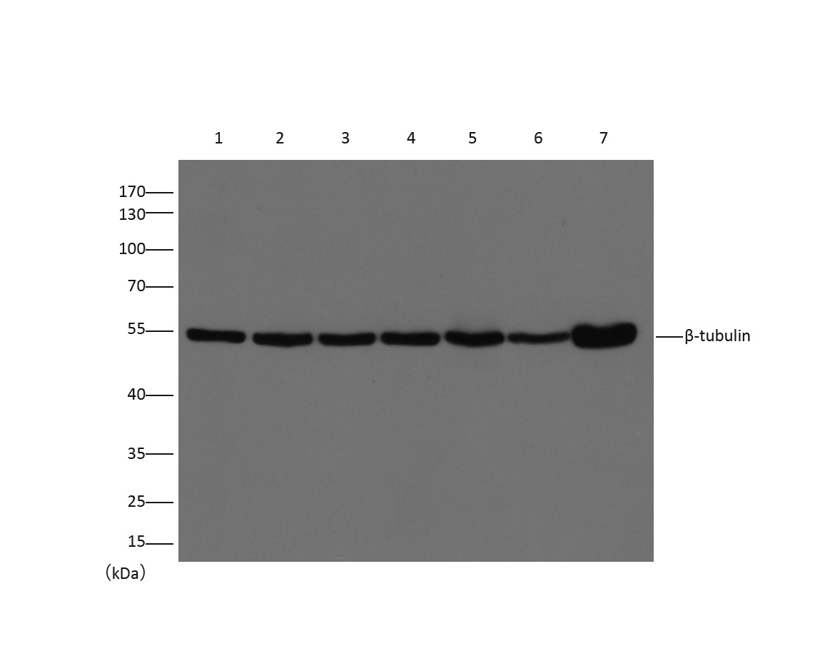 Microtubules are constituent parts of the mitotic apparatus, cilia, flagella, and elements of the cytoskeleton. They consist principally of 2 soluble proteins, alpha- and beta-tubulin, each of about 55,000 Da. Antibodies against beta Tubulin are useful as loading controls for Western Blotting. However it should be noted that levels of β-Tubulin may not be stable in certain cells. For example, expression of β-Tubulin in adipose tissue is very low and therefore β-Tubulin should not be used as loading control for these tissues.