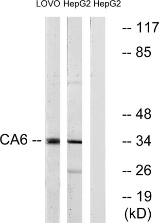 The antiserum was produced against synthesized peptide derived from human CA6. AA range:231-280