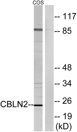 Western blot analysis of lysates from COS cells, using CBLN2 Antibody. The lane on the right is blocked with the synthesized peptide.