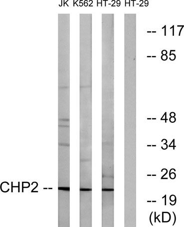 The antiserum was produced against synthesized peptide derived from human CHP2. AA range:101-150