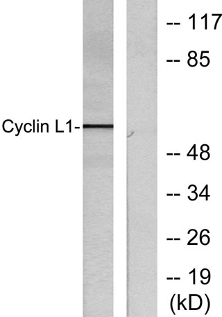 The antiserum was produced against synthesized peptide derived from human Cyclin L1. AA range:461-510