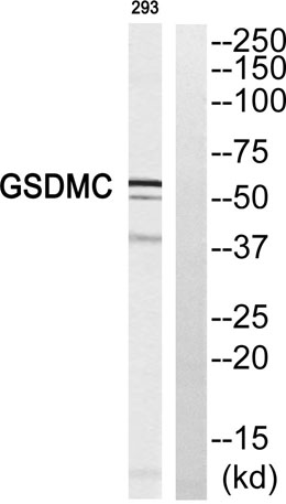 Western blot analysis of GSDMC Antibody. The lane on the right is blocked with the GSDMC peptide.