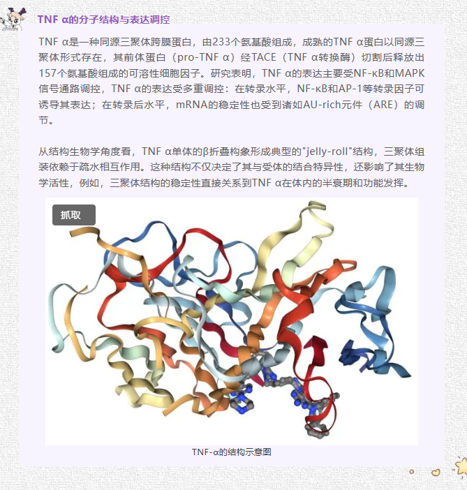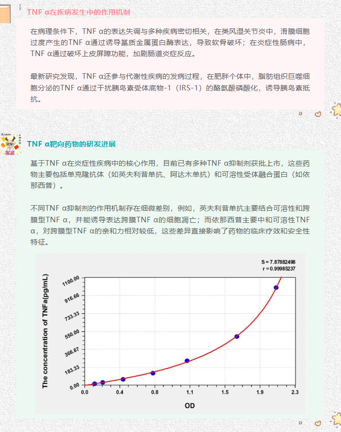 腫瘤壞死因子α(Tumor Necrosis Factor-α, TNF α)是由巨噬細(xì)胞和單核細(xì)胞分泌的促炎細(xì)胞因子, 分子質(zhì)量為17.4 kDa或26 kDa,對應(yīng)于全長跨膜蛋白的 C 端胞外結(jié)構(gòu)域,可由多種細(xì)胞分泌,包括脂肪細(xì)胞、活化的單核細(xì)胞、巨噬細(xì)胞、B細(xì)胞、T細(xì)胞和成纖維細(xì)胞,其中,主要由巨噬細(xì)胞產(chǎn)生的TNF被命名為TNF-α,具有細(xì)胞增殖、代謝激活、炎癥反應(yīng)和免疫調(diào)節(jié)過程。