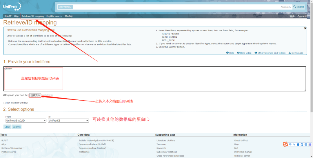 假如需要查詢(xún)的蛋白較多,則可以通過(guò)點(diǎn)擊首行任務(wù)欄Retrieve/ID mapping,如下圖,查詢(xún)蛋白列表可直接粘貼在下圖1. Provide your identifiers文本框中,也可以將蛋白ID單列粘貼于TXT文本中提交到網(wǎng)站。另外該頁(yè)面2. Select options 還可提供ID轉(zhuǎn)換功能,支持多種數(shù)據(jù)庫(kù)間的ID轉(zhuǎn)換。