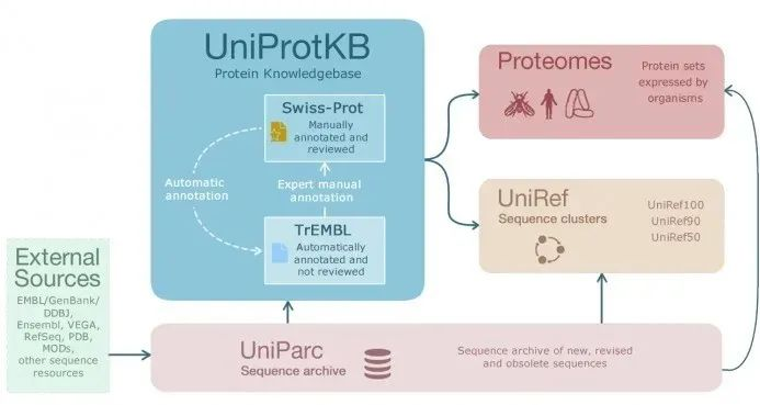 以上子數(shù)據(jù)庫(kù)間的關(guān)系如下:uniprot會(huì)收集EMBL,GenBank,DDBJ等公共數(shù)據(jù)庫(kù)中的蛋白質(zhì)序列及功能信息等原始數(shù)據(jù),處理后存入U(xiǎn)niParc的非冗余蛋白質(zhì)序列數(shù)據(jù)庫(kù);UniPrc作為數(shù)據(jù)倉(cāng)庫(kù),再分別給UniProtKB,Proteomes,UNIRef提供可靠的數(shù)據(jù)集,其中在UniProtKB數(shù)據(jù)庫(kù)中Swiss-Prot是由TrEMBL經(jīng)過(guò)手動(dòng)注釋后得到的高質(zhì)量非冗余數(shù)據(jù)庫(kù),也是我們最常用的蛋白質(zhì)數(shù)據(jù)庫(kù)之一。