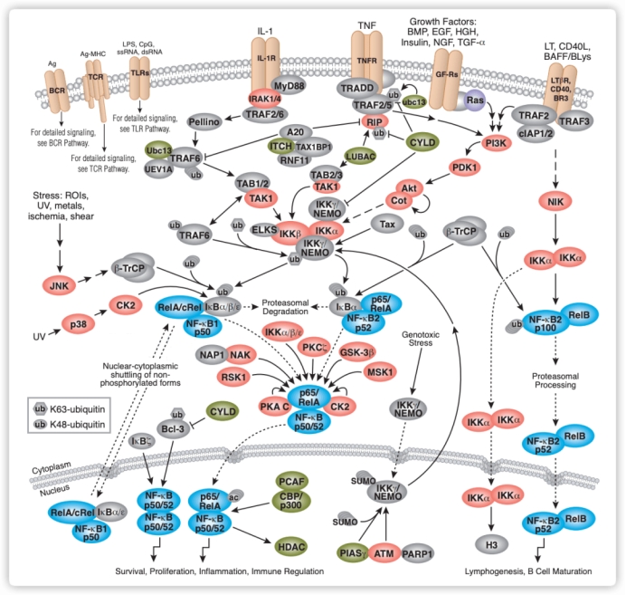 NF-kB家族有由cRel, RelA (p65) , RelB, NF-kB1 (p50)、NF-kB2 (p52)組成,它們在N端都具有Rel同源結(jié)構(gòu)域,其中cReI, ReIA (p65)和ReIB存在轉(zhuǎn)錄激活區(qū)(TAD),可正向調(diào)節(jié)基因表達(dá);p52和p50分別由前體蛋白p100、p105裂解而成,前體蛋白的C端有類似于NF-kB抑制劑(IκB)的結(jié)構(gòu),作為IkB樣蛋白抑制NF-kB功能,它們的同源二聚體可以抑制轉(zhuǎn)錄。