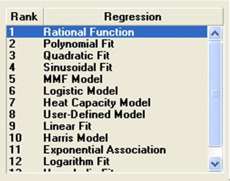 5. 在對話框的右上角出現(xiàn)一些曲線的名稱,從“1”開始依次點擊曲線名稱,在右下角會出現(xiàn)相應(yīng)擬合的曲線。(一般選擇第一個多項式擬合)