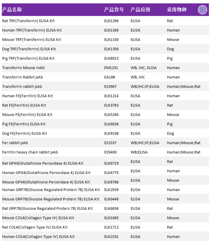 作為生命科學及醫(yī)學領域的蛋白抗體供應商,ELK biotechnology可為鐵死亡相關研究提供高品質(zhì)的試劑,這里將鐵死亡部分產(chǎn)品列出來以便大家參考,詳情見下表: