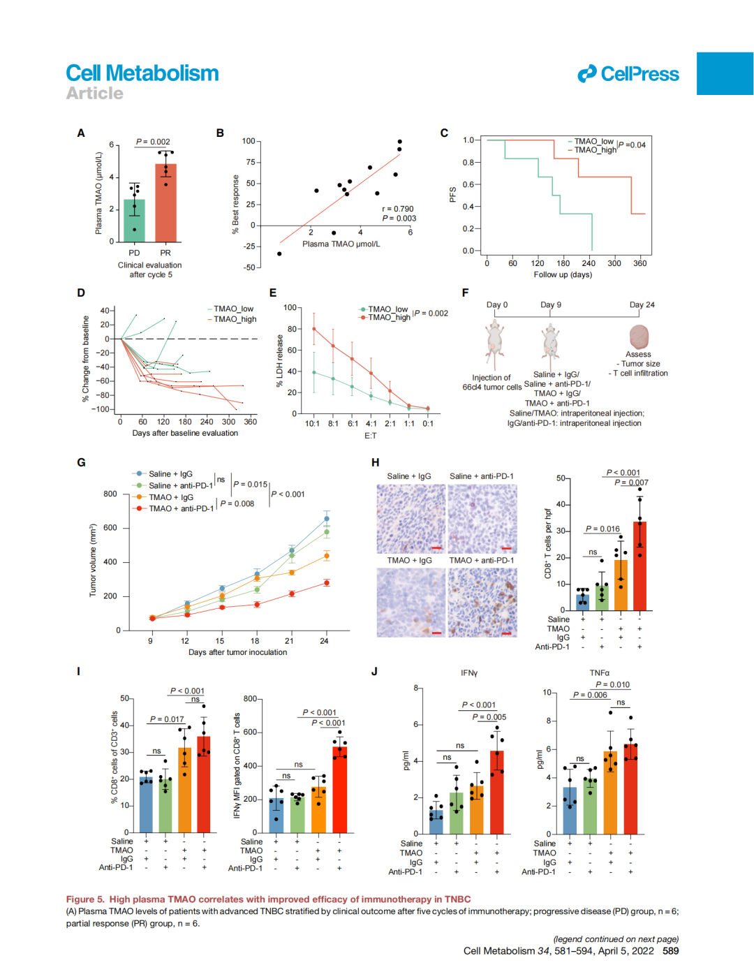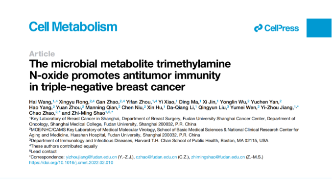 乳腺癌的發(fā)病率逐年增高,并成為中國女性發(fā)病率最高的惡性腫瘤,是人們常說的“紅顏殺手”。其中,三陰性乳腺癌惡性程度較高,患者生存預(yù)后較差,易出現(xiàn)早期復(fù)發(fā)和轉(zhuǎn)移,且既往缺乏有效的針對性治療策略,素有最“毒”乳腺癌之稱。近日,復(fù)旦大學(xué)腫瘤醫(yī)院邵志敏教授、江一舟教授課題組攜手復(fù)旦大學(xué)基礎(chǔ)醫(yī)學(xué)院教育部/衛(wèi)健委/醫(yī)科院醫(yī)學(xué)分子病毒學(xué)重點(diǎn)實(shí)驗(yàn)室趙超課題組,發(fā)現(xiàn)微生物代謝產(chǎn)物氧化三甲胺(TMAO)可以激活抗腫瘤免疫,提高三陰性乳腺癌免疫治療療效。這意味著微生物代謝產(chǎn)物TMAO有望成為三陰性乳腺癌臨床免疫治療的新策略,助推免疫治療。該項(xiàng)重要研究成果已在北京時間3月12日凌晨在國際權(quán)威期刊Cell Metabolism(《細(xì)胞代謝》)以封面文章發(fā)表。