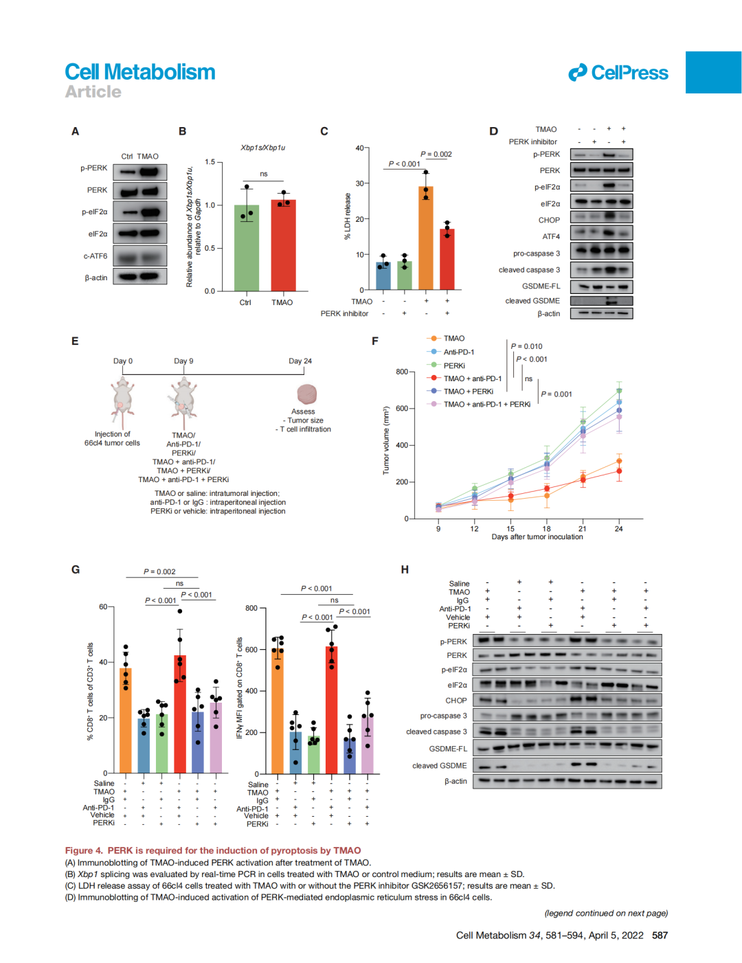 團(tuán)隊進(jìn)一步探究TMAO是如何幫助人體抑制三陰性乳腺癌的。研究團(tuán)隊基于小鼠動物模型開展相關(guān)實(shí)驗(yàn),發(fā)現(xiàn)上調(diào)瘤內(nèi)TMAO水平可以通過增加瘤內(nèi)微環(huán)境中CD8+ T細(xì)胞的浸潤,激活CD8+ T細(xì)胞的功能并有效抑制三陰性乳腺癌的生長。機(jī)制探索發(fā)現(xiàn),TMAO誘導(dǎo)乳腺癌細(xì)胞發(fā)生由GSDME介導(dǎo)的焦亡,向微環(huán)境內(nèi)釋放大量炎性因子,從而增加微環(huán)境中CD8+ T細(xì)胞的浸潤,并激活CD8+ T細(xì)胞發(fā)揮抗腫瘤功能。研究同時發(fā)現(xiàn),TMAO誘導(dǎo)的腫瘤細(xì)胞焦亡與內(nèi)質(zhì)網(wǎng)應(yīng)激密切相關(guān)。TMAO通過活化PERK蛋白,進(jìn)一步切割GSMDE的上游蛋白caspase-3誘導(dǎo)腫瘤細(xì)胞發(fā)生焦亡。
